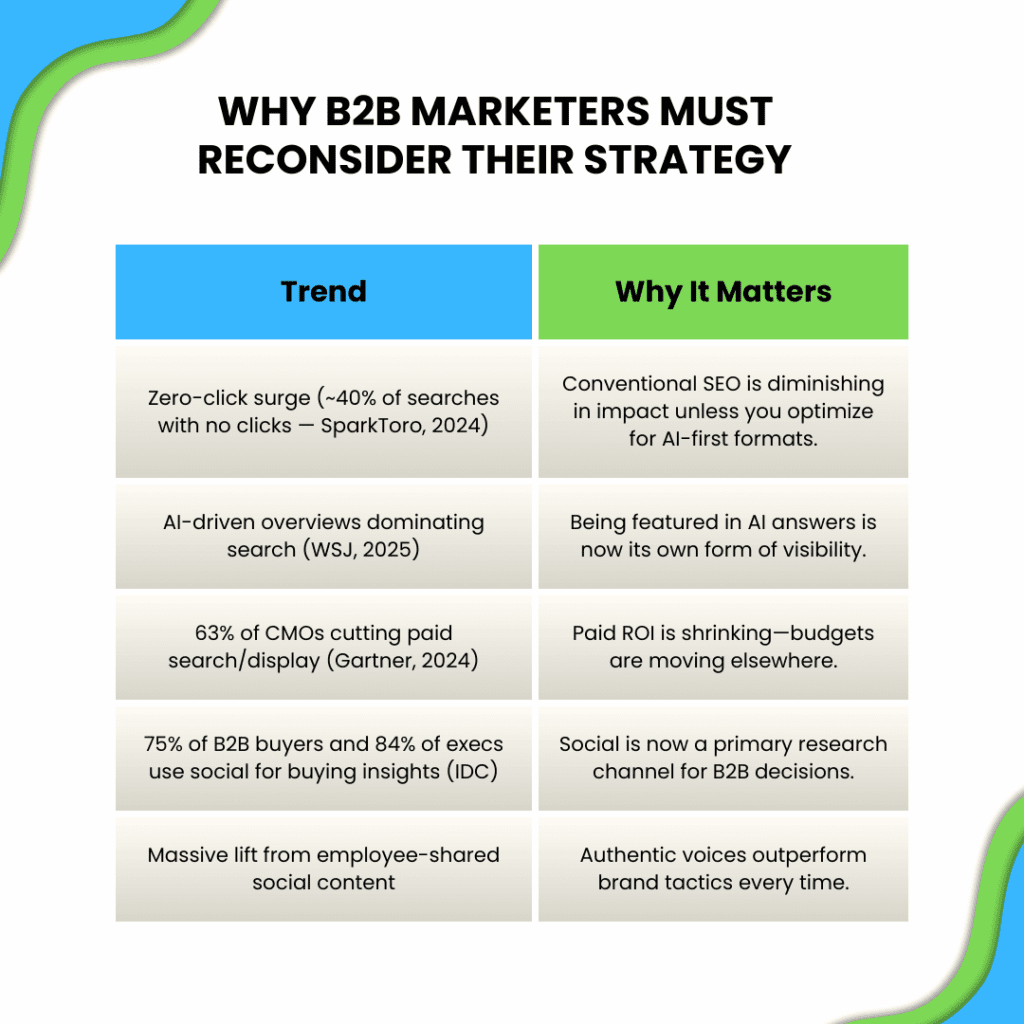 Google searches increasingly end before anyone clicks. AI-generated answers are taking center stage. And budgets for paid search and display are shrinking as executives look for more reliable ways to influence B2B buyers.